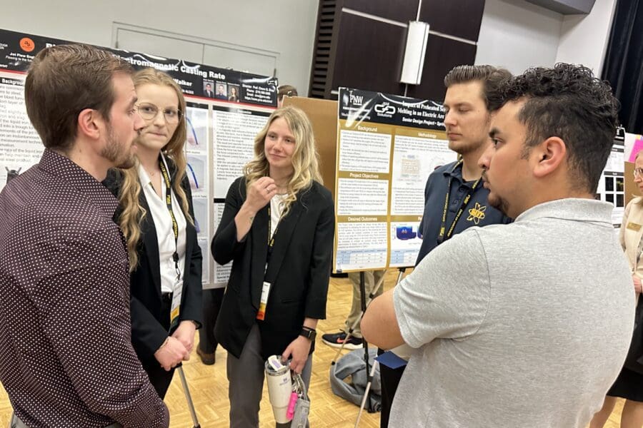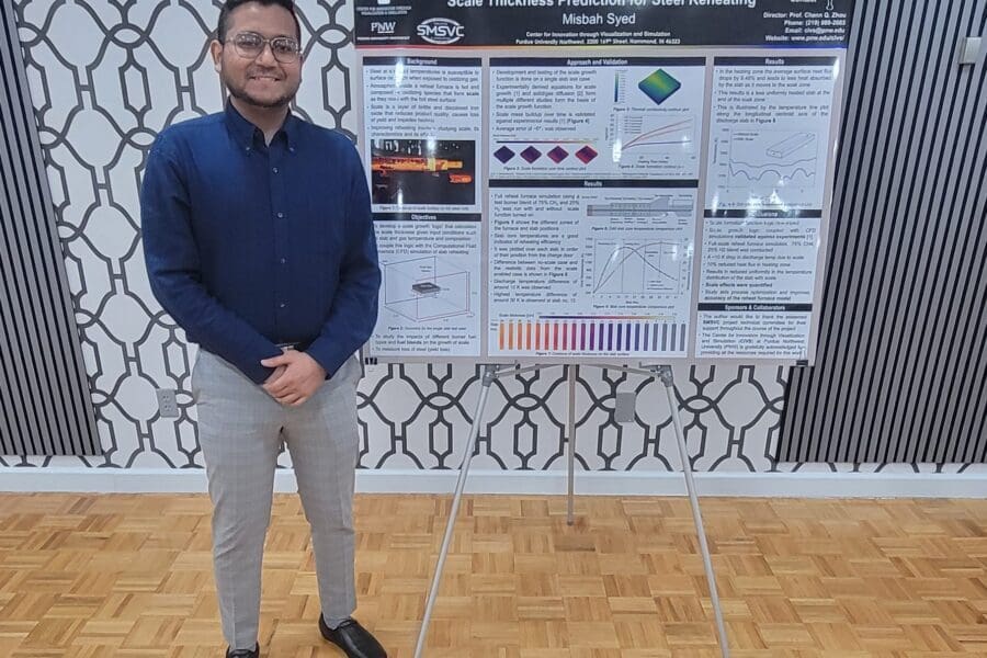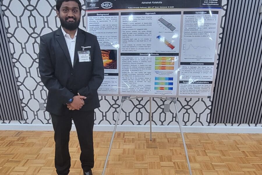 On Thursday, April 18, over 20 CIVS research students participated in poster presentations to showcase their projects during the 2024 PNW Day of Discovery in Alumni Hall. Presentations included research topics such as Hydrogen Combustion in a Reheating Furnace, Computational Fluid Dynamics Modeling, Hazard Detection, 360-degree Video Integration, Virtual Reality Applications, and Study of Hydrogen Fuel.
