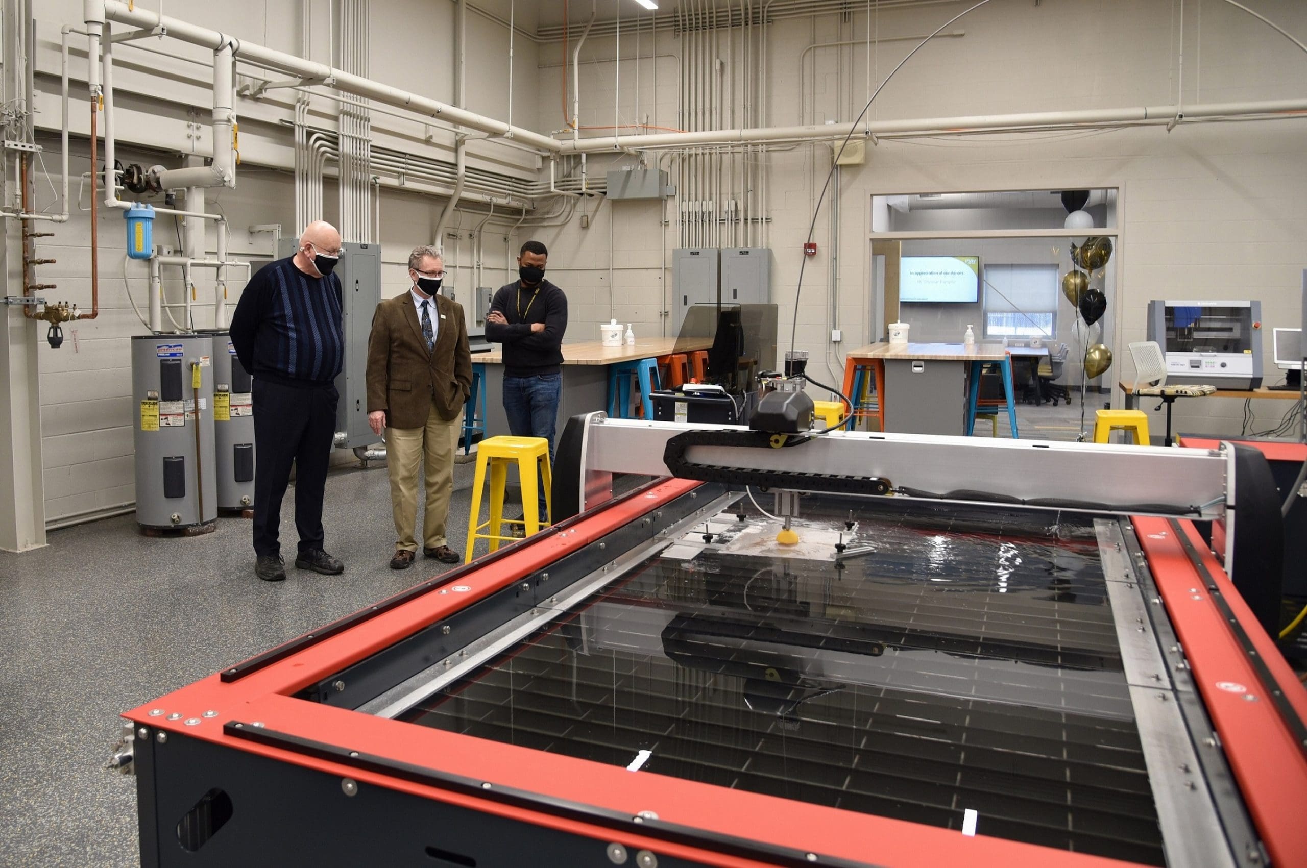 (l-r) Stewart McMillan, chairman emeritus of Task Force Tips, tours the new PNW Design Studio with Dietmar Rempfer, director of the PNW School of Engineering and Marcel Mejulu, Design Studio support technician. Generous gifts from PNW alumnus McMillan and his wife, Kathryn, made it possible for PNW to establish the student-centered Design Studio.