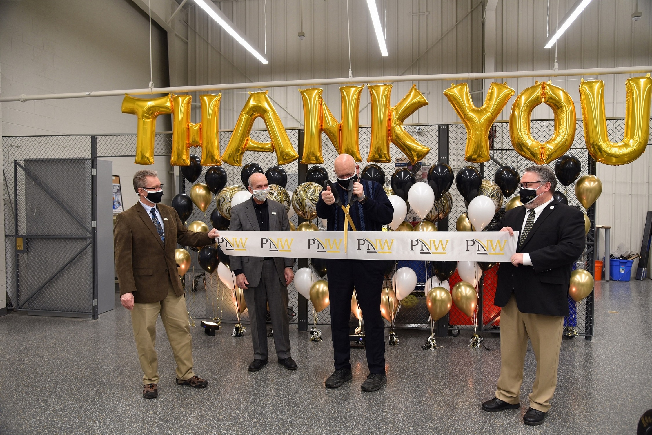 (From left): Dietmar Rempfer, director of the Purdue University Northwest (PNW) School of Engineering; PNW Chancellor Thomas L. Keon; Stewart McMillan, chairman emeritus of Task Force Tips; and Kenneth C. Holford, PNW provost and vice chancellor for Academic Affairs, cut the ribbon on the PNW Design Studio.