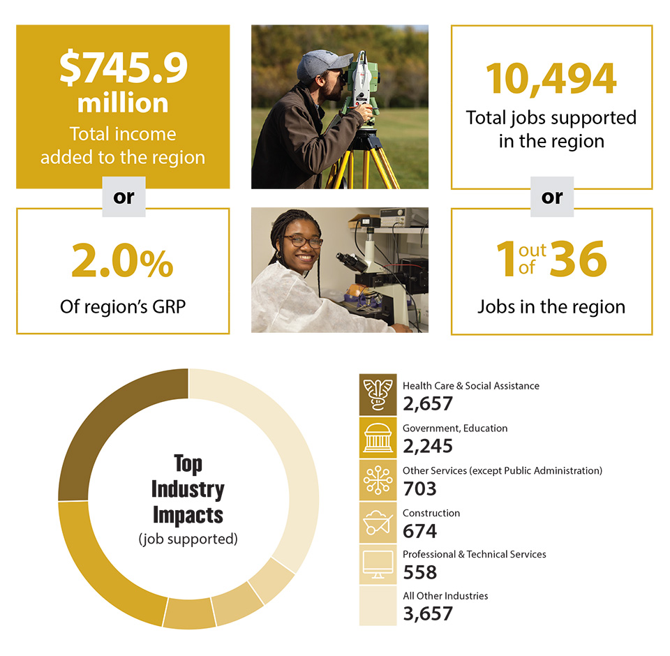 Our impact includes $745.9 million of total income, which accounts for 2 percent of gross regional product. That figure includes research conducted, start-ups launched and visitors welcomed.