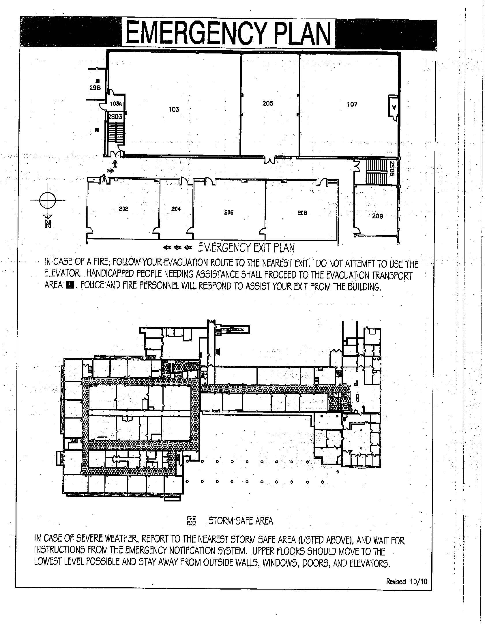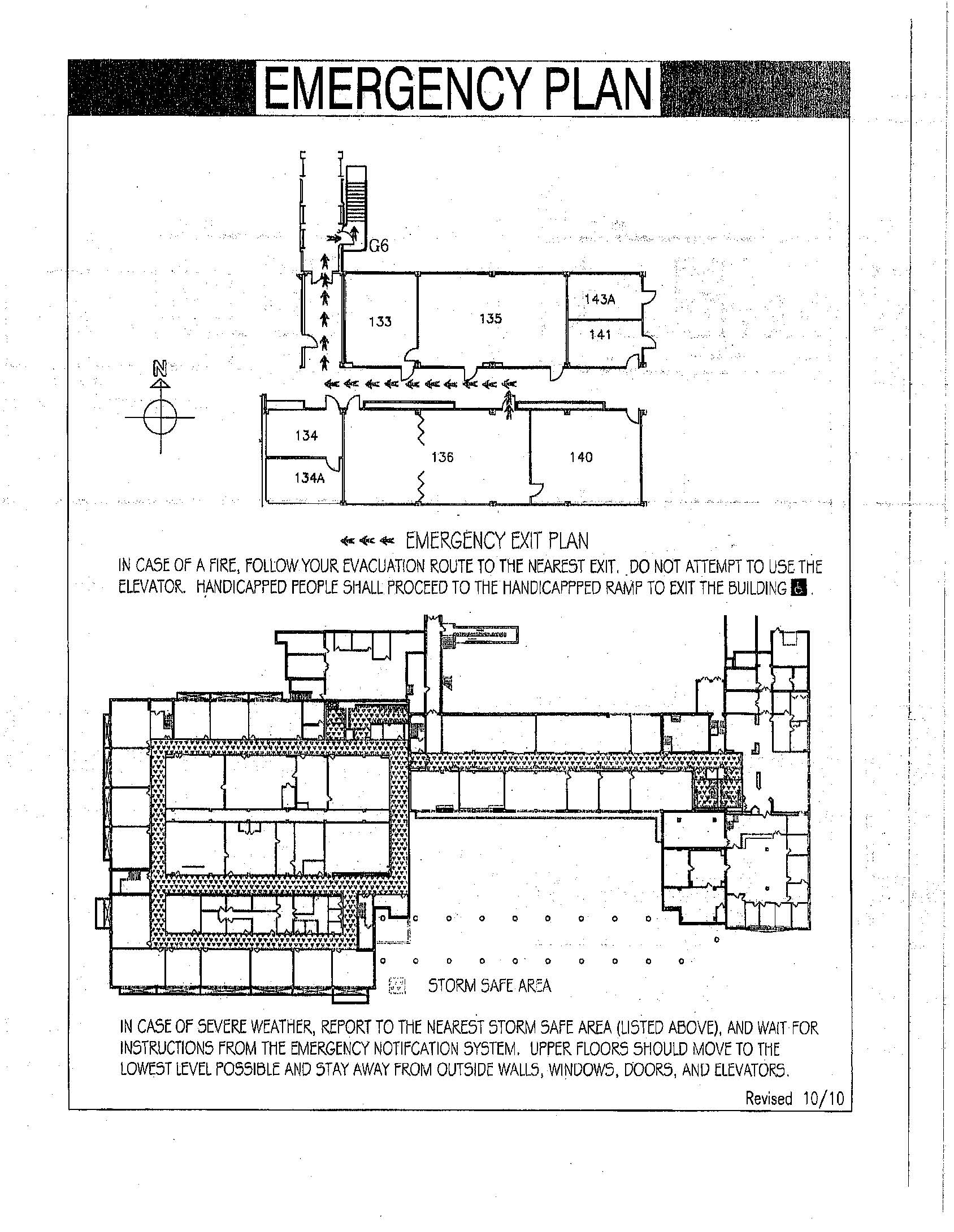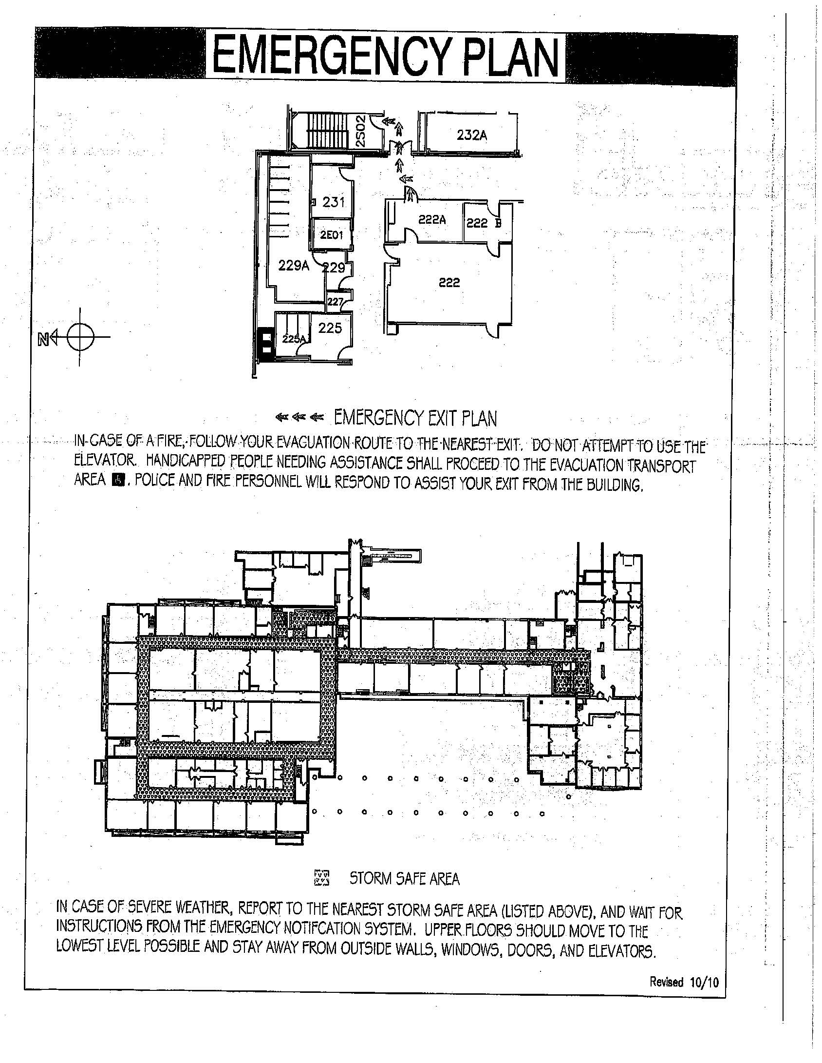 In case of severe weather, report to the nearest storm safe area, and wait for instructions from the emergency notification system. Upper floors should move to the lowest level possible and stay away from outside walls, windows, doors, and elevators.